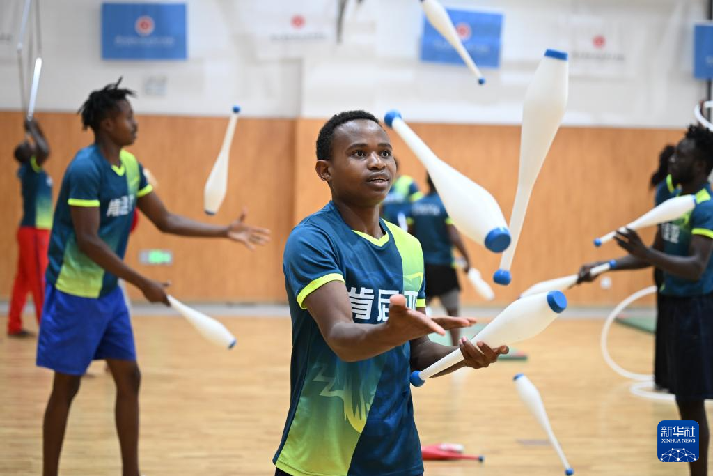 9月28日,一名來自肯尼亞的學員在河北吳橋雜技藝術學校排練廳內練習雜技。