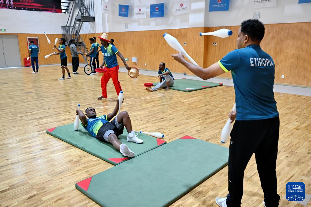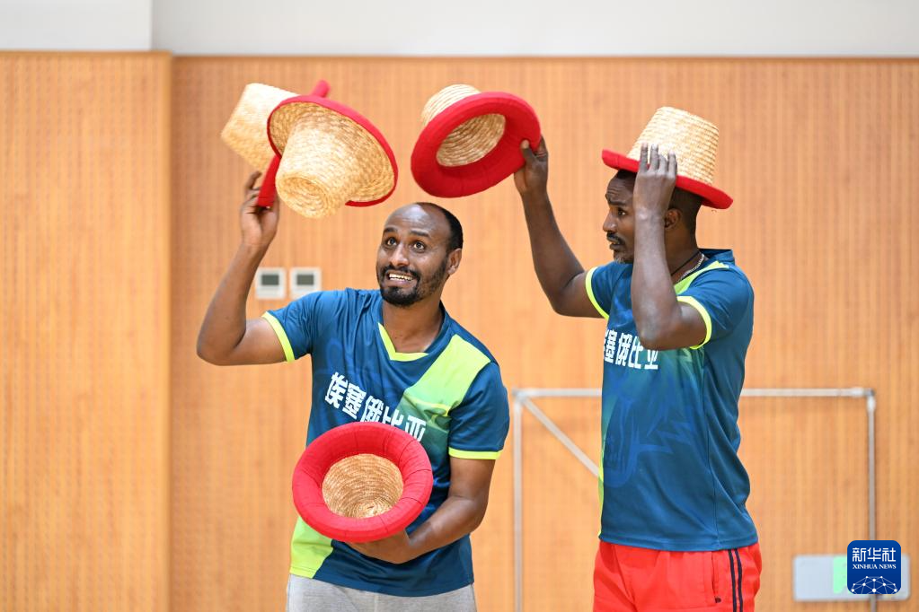 9月28日,兩名來自埃塞俄比亞的學員在河北吳橋雜技藝術學校排練廳內練習帽子技巧。