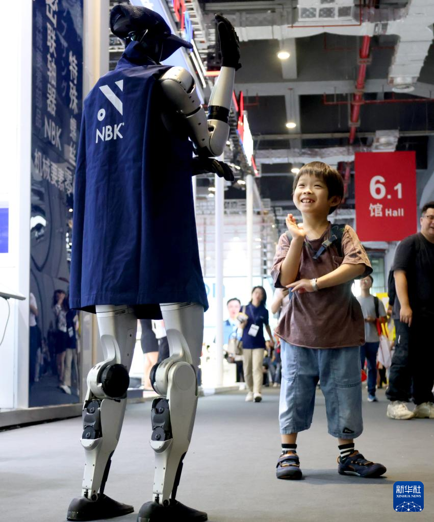 9月23日,中國小朋友在展會現場與人形機器人互動。國際工業
