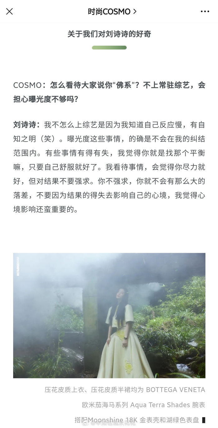 摘要:9月24日,據九派新聞視頻、時尚COSMO報道,劉詩詩在最新采訪中解釋“佛系”評價與不上常駐綜藝的原因:自己反應慢,有些事情有得有失,只要自己舒服就好了。回應如下:我不怎么上綜藝是因為我知道自己反應慢