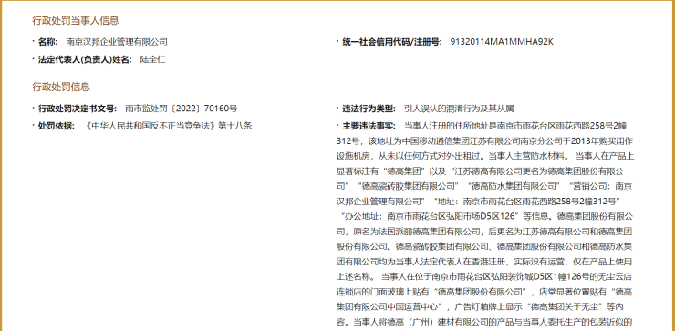 此外,2022年,南京市雨花臺區市場監督管理局也對陸某仁控制的南京漢邦企業管理有限公司做出行政處罰(雨市監處罰〔2022〕70160號),認定其存在“引人誤認的混淆行為”,處以罰款80萬元并沒收侵權產品。